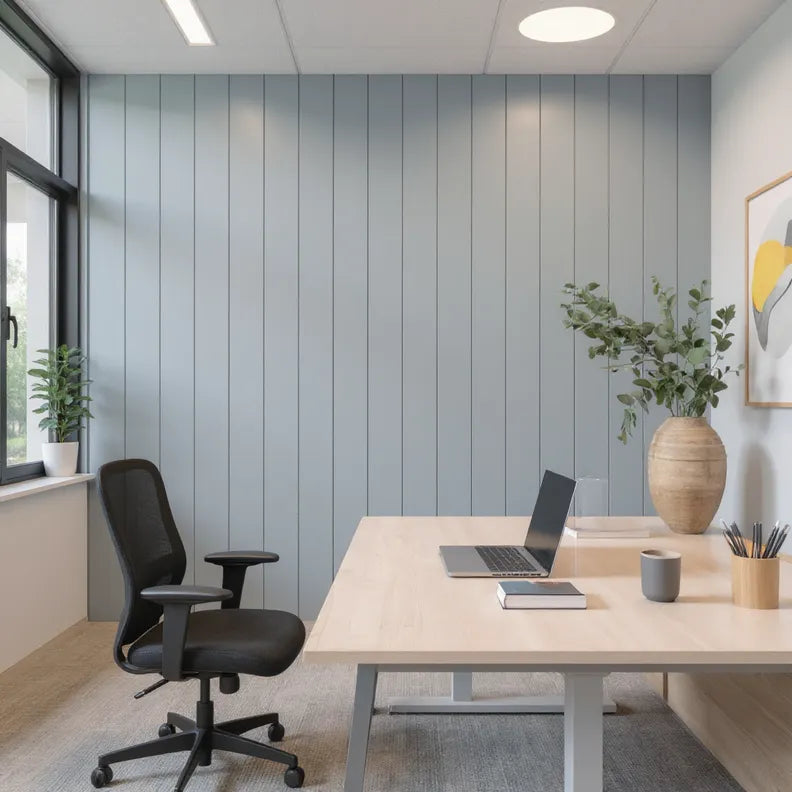 A modern home office with soft blue vertical wall panelling, a light wooden desk, and minimalist decor. The space features a laptop, books, and greenery, creating a clean and calming work environment.